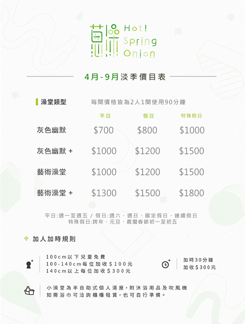 ✔單人泡湯注意事項請點選此處詳閱=>《蔥澡單人泡湯規則》